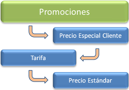 La entrada de pedidos y albaranes calcula el precio y los descuentos asociados en el momento de entrar cada línea, atendiendo a unas prioridades preestablecidas. Para obtener por defecto el precio de venta de un producto, se tienen en cuenta los siguientes pasos: