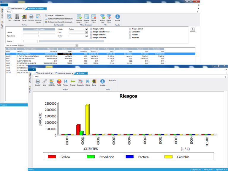 Durante el proceso comercial, el riesgo se organiza en las diferentes fases (Pedidos, Albaranes, facturación y contabilidad). A medida que avanza el circuito comercial, el riesgo se traspasa de una fase a otra, para marcar en que etapa está y detectar rápidamente algún punto crítico.