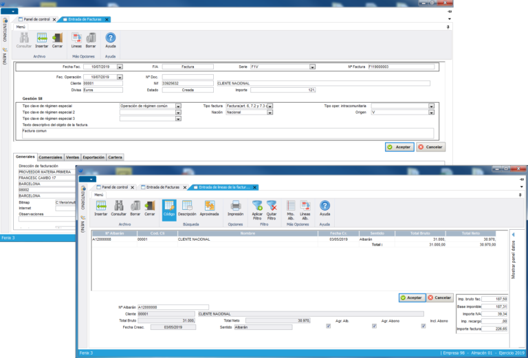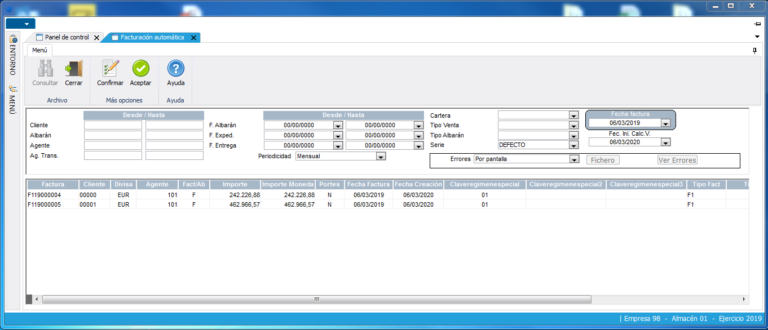 La confección de facturas de los clientes se realiza por dos métodos diferentes. El primero es partir de una entrada manual, donde se van seleccionando e incluyendo uno a uno los albaranes o devoluciones en la factura. El segundo es partir de un proceso de facturación automática, el cual genera las facturas según las condiciones existentes en los albaranes, (creando una factura por albarán, o agrupando los albaranes similares, o agrupando albaranes y devoluciones, etc.), solicitando una confirmación posterior para validarlas.