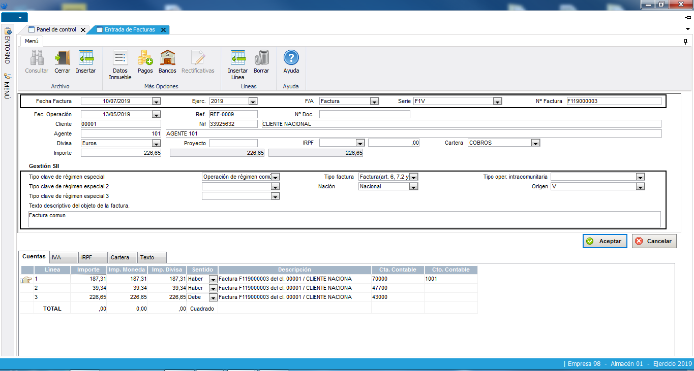 Entrada de facturas contable de ventas.