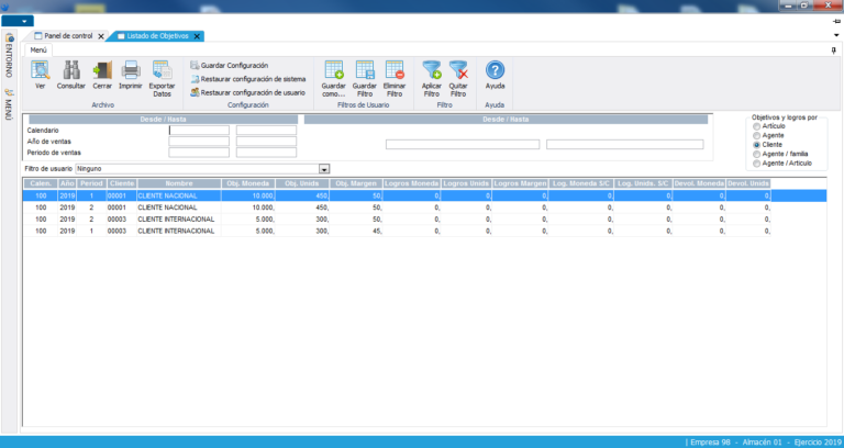Definición de los objetivos a alcanzar por la empresa a nivel de cliente, representante y artículo para un periodo comercial. La imputación tiene en cuenta si las ventas son con cargo o sin cargo, las devoluciones realizadas, las unidades e importes vendidos, obteniendo de esta manera la rentabilidad neta (margen) de un cliente, representante y artículo.