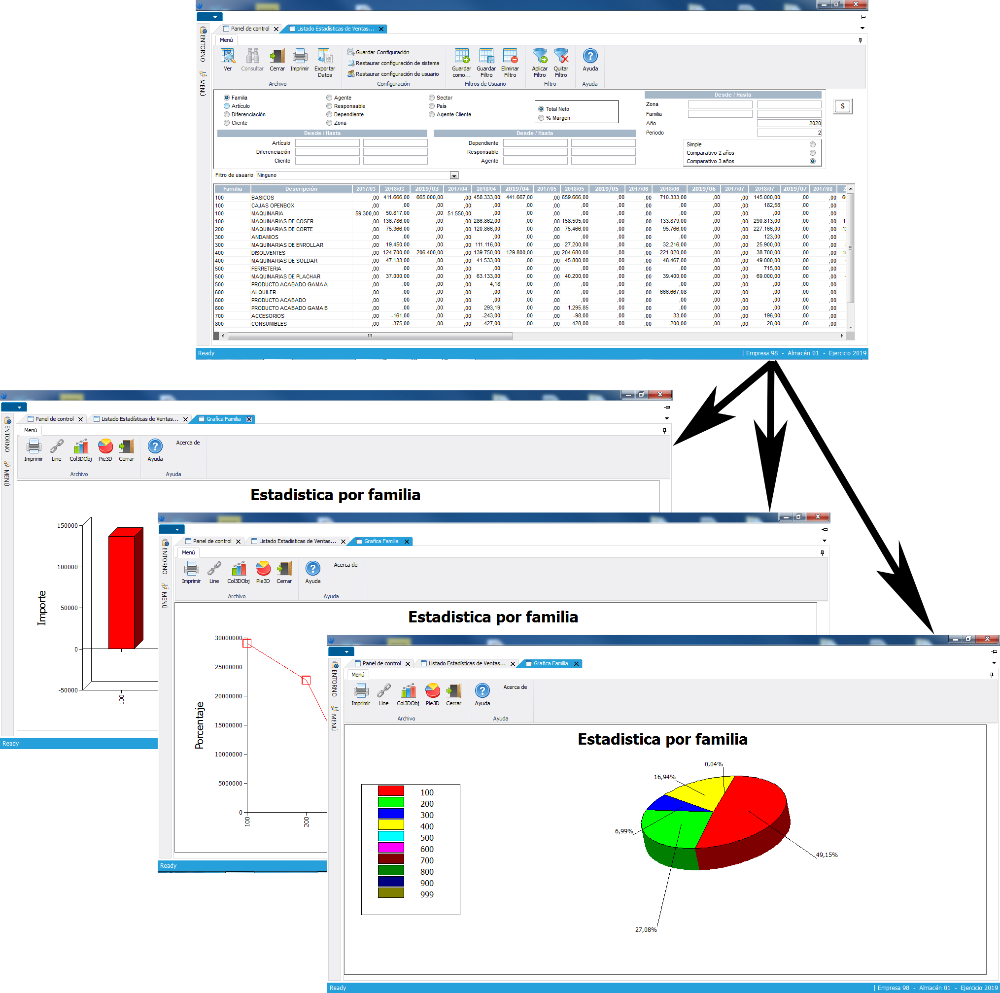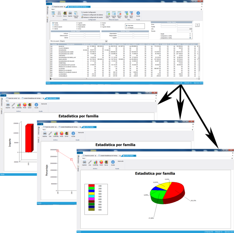 Agrupación de la información en estructuras intermedias para su posterior explotación por parte de los usuarios, obteniendo, además de un amplio abanico de estadísticas, un corto periodo de ejecución de las mismas. Las consultas y listados proporcionan información sobre todas las estructuras implicadas en el proceso mercantil (Periodos, Clientes, Artículos, familias, representantes, dependientes, características de los documentos, etc.). El sistema permite multitud de agrupaciones y clasificaciones por cada uno de los conceptos, pudiendo analizar las ventas por unidades e importes, los costes, las rentabilidades, etc.