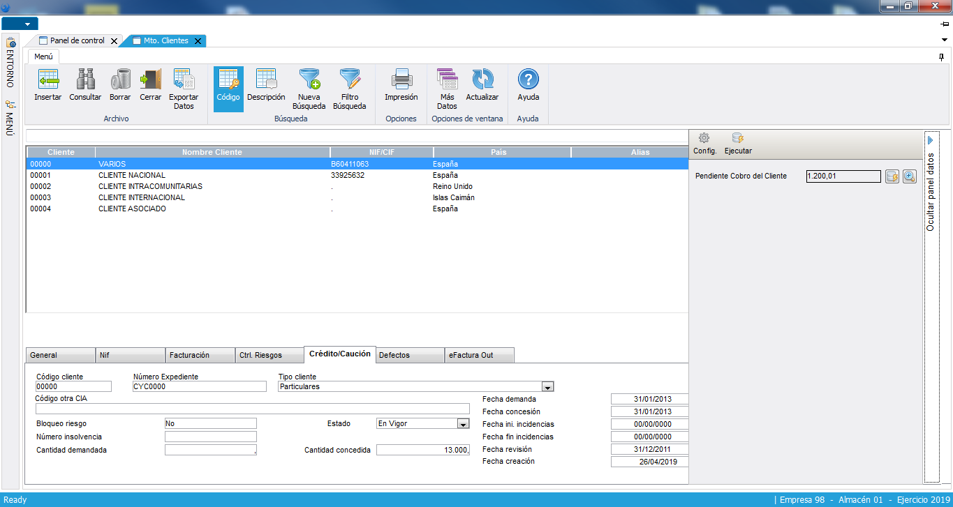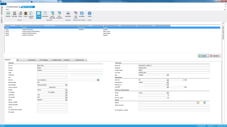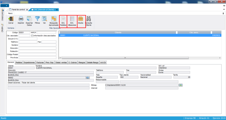 Con el fin de poder dar a los clientes un servicio inmediato de respuesta a las cuestiones que plantean, se ha dotado al sistema de un módulo por el que podrá “navegar” desde una misma pantalla por toda la información que se dispone del cliente. La búsqueda del cliente se podrá efectuar por un amplio abanico de parámetros (nombre, código, dirección, código postal, población, etc.). Además esta búsqueda es estricta o aproximada (cliente cuyo nombre empiece por “e” o que la contenga). Una vez encontrado y seleccionado un cliente, se dispone de múltiples carpetas que contienen toda la información del cliente (datos generales, pedidos, albaranes, facturas, cartera, estadísticas, precios, condiciones especiales, riesgos detallados, etc.) facilitando y agilizando la toma de decisiones sobre nuestra relación mercantil. Además una vez seleccionado el cliente, se accede directamente a la entrada de pedidos y expediciones, centralizando el inicio del circuito comercial en un solo proceso. Así mismo también se accede a la información de los stocks de los artículos de los almacenes y al mantenimiento de clientes pero solo a nivel de consulta.
