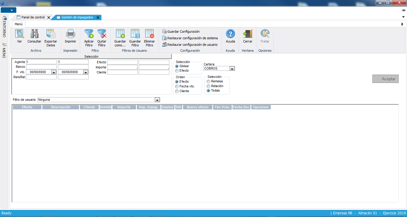 Control de los documentos en estado pendiente que hayan vencido en el margen de días indicado por el usuario y con un importe mínimo. Se puede realizar una consulta de los impagados que se hayan comunicado o no a crédito y caución. Control de los impagados ya resueltos.