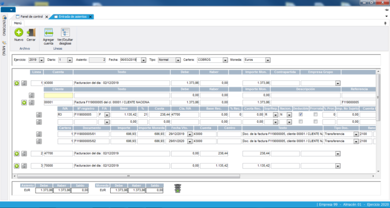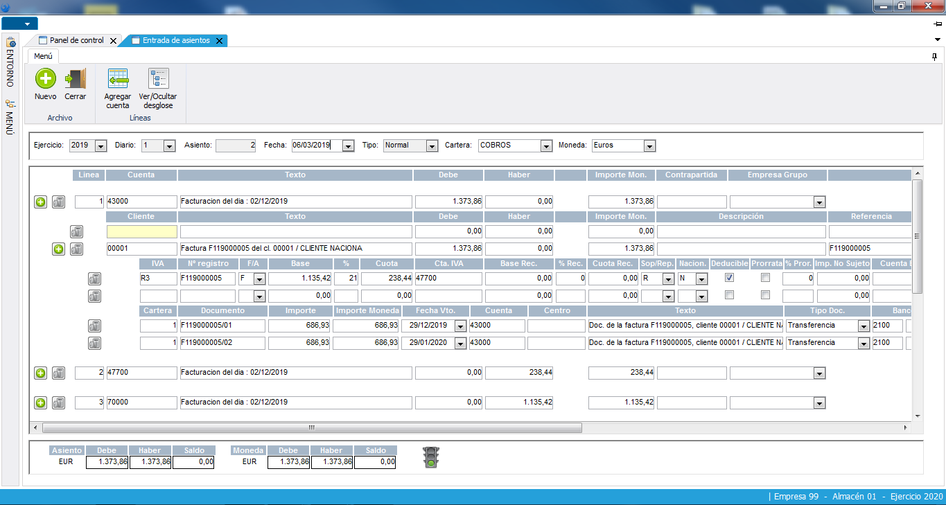 La mayoría de los asientos se generan automáticamente en los diferentes módulos del sistema. Para aquellos que se tengan que introducir manualmente existe esta entrada de asientos, es un proceso realizado a tres monedas diferentes. Ofrece la opción de trabajar con asientos predefinidos (ej.: Nóminas) y permite la contrapartida automática de varias líneas seleccionadas por asiento. Gestión automática de las diferencias de cambio producidas por la operativa en diferentes monedas. Imputación a todas las estructuras contables.