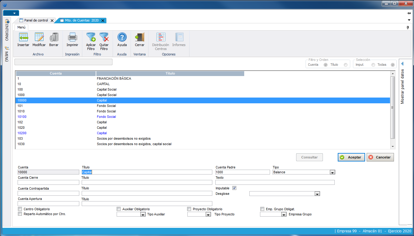 Ofrece el plan contable a 5 dígitos, con posibilidad de alcanzar hasta los 16 por cuenta. Hasta 8 niveles jerárquicos. Gran diversidad de definición en las relaciones con el resto de estructuras contables, (centros de coste, con o sin distribución predeterminada, centros auxiliares, proyectos, empresas del grupo, cuentas corrientes de cliente, proveedor/banco, etc.).
