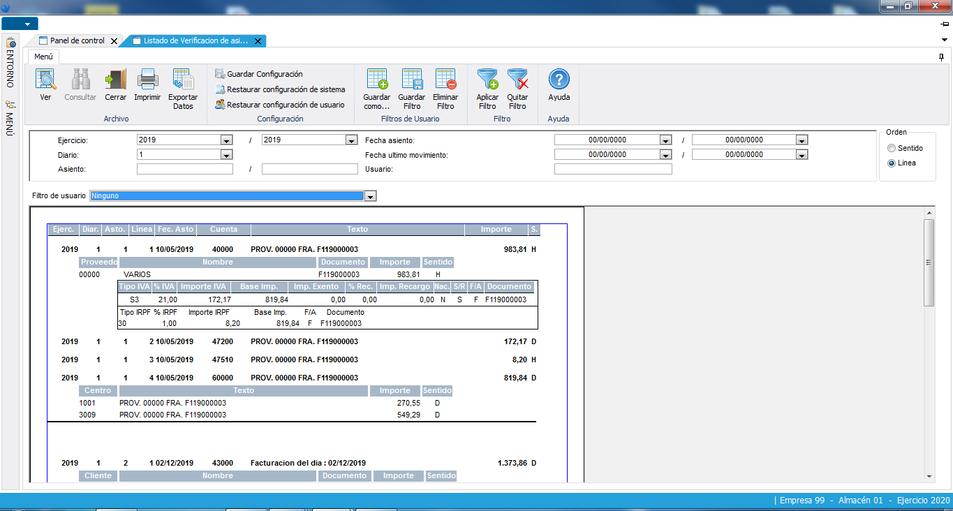 Búsqueda de los asientos contables realizados por multitud de conceptos, (por ejercicio, diario, asiento, fecha, cuenta, importe, moneda, periodo, documento, texto, etc.).