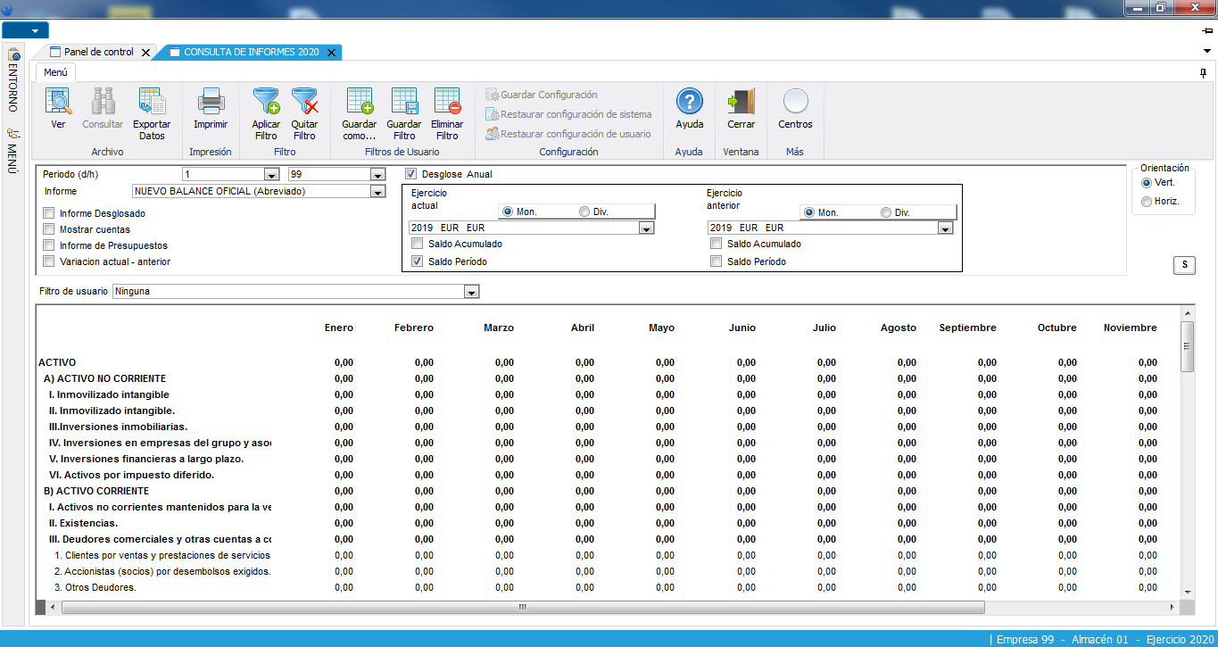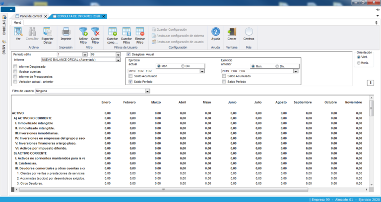 El usuario puede diseñar desde la aplicación sus propios informes para el análisis de la situación financiera. FENIX incluye los informes oficiales predefinidos (Pérdidas y Ganancias, Balance de Situación, etc.).