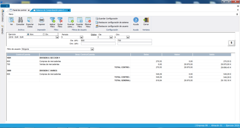 Hasta 16 dígitos por centro con 8 niveles de definición. Estructura vinculada al ejercicio contable.