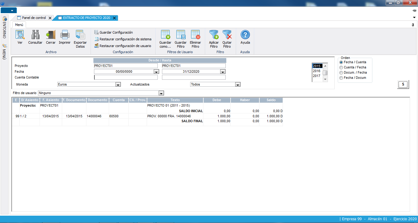 Permite trabajar con varios ejercicios abiertos simultáneamente. A cada ejercicio se le asocia la fecha de inicio y final, permitiendo que este corresponda a un año natural o no, en función de las necesidades. Así mismo, también se le asocian los períodos contables en los que se quiere dividir (en caso de año natural serán los meses), manteniendo un periodo de apertura y otro de cierre. Los periodos se pueden cerrar de forma individual, impidiendo la gestión contable sin necesidad del cierre completo del ejercicio. Las estructuras contables (plan contable) y extracontables (centros de coste y presupuestos) se asocian a cada uno de los ejercicios de forma independiente, dando la posibilidad de mantenerlas al definir el nuevo ejercicio. Asignación de dos monedas a cada ejercicio independientemente de la empresa. La moneda con la que se desea obtener la información contable y la divisa para el tratamiento paralelo de la información. También se permite la gestión de prorrata diferenciada para cada ejercicio.