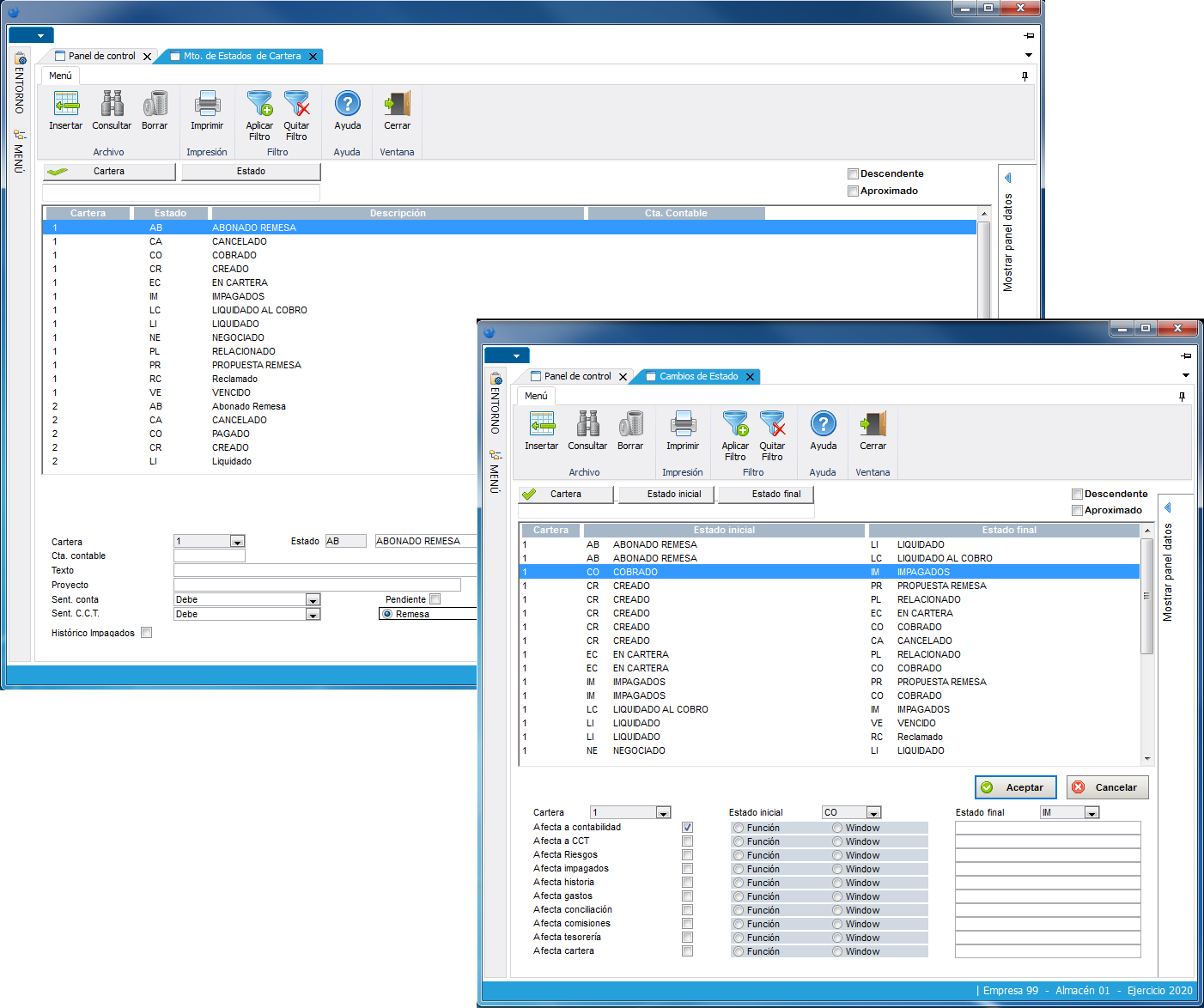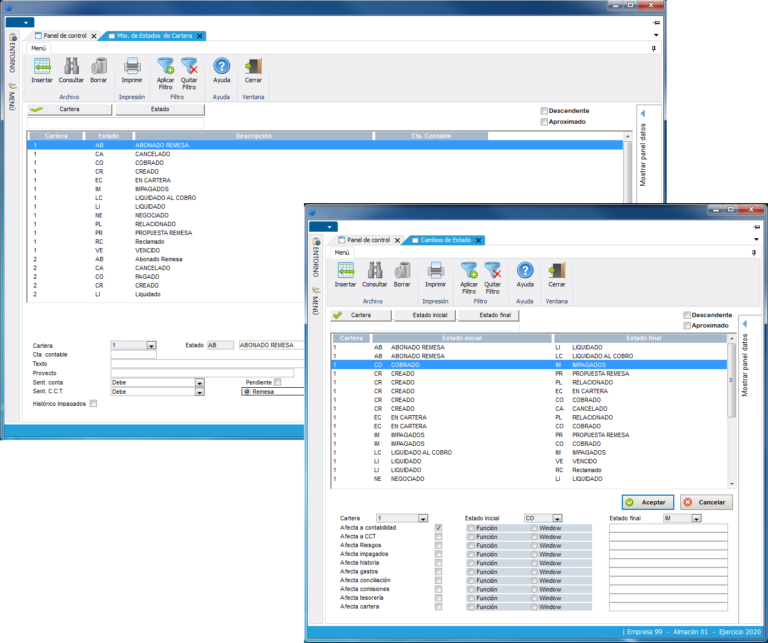 Posibilidad de parametrizar los diferentes estados con los que se desea trabajar. Definición de las Relaciones que existen entre los diferentes estados iniciales y finales que puede tener el Efecto. Sirve para particularizar la manera de gestionar la Cartera de Cobros y Pagos.