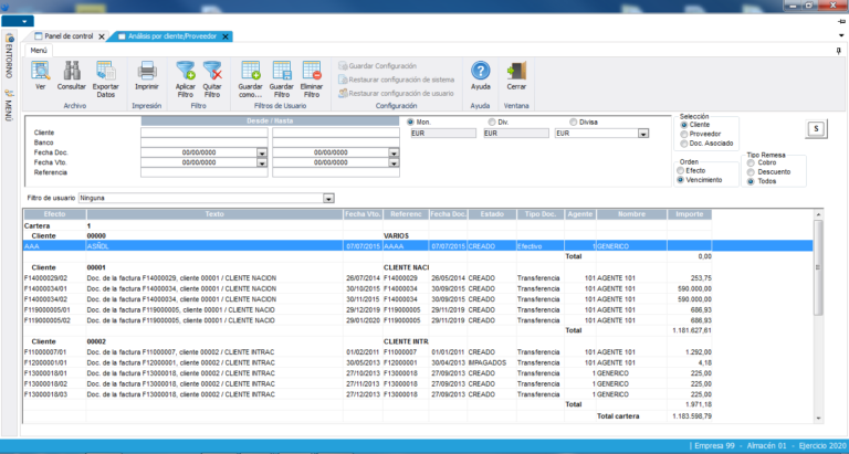 Los diferentes listados de la cartera permiten un análisis completo de su situación (días promedio de cobro/pago, riesgo de bancos, antigüedad de la deuda, etc.). Control real de los días reales versus teóricos de pago.