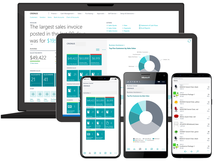 En su PC, portátil, tableta, smartphone… obtenga siempre las mismas potentes capacidades y funcionalidades sea cual sea el dispositivo en el que esté trabajando. Dynamics 365 Business Central ofrece una experiencia consistente y segura en Windows, iOS y Android.