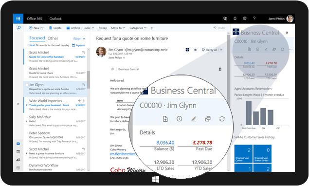 Acelere el proceso de presupuesto a efectivo. Actúe rápidamente ante consultas de ventas, gestione solicitudes de servicio y procese pagos, todo desde Outlook.