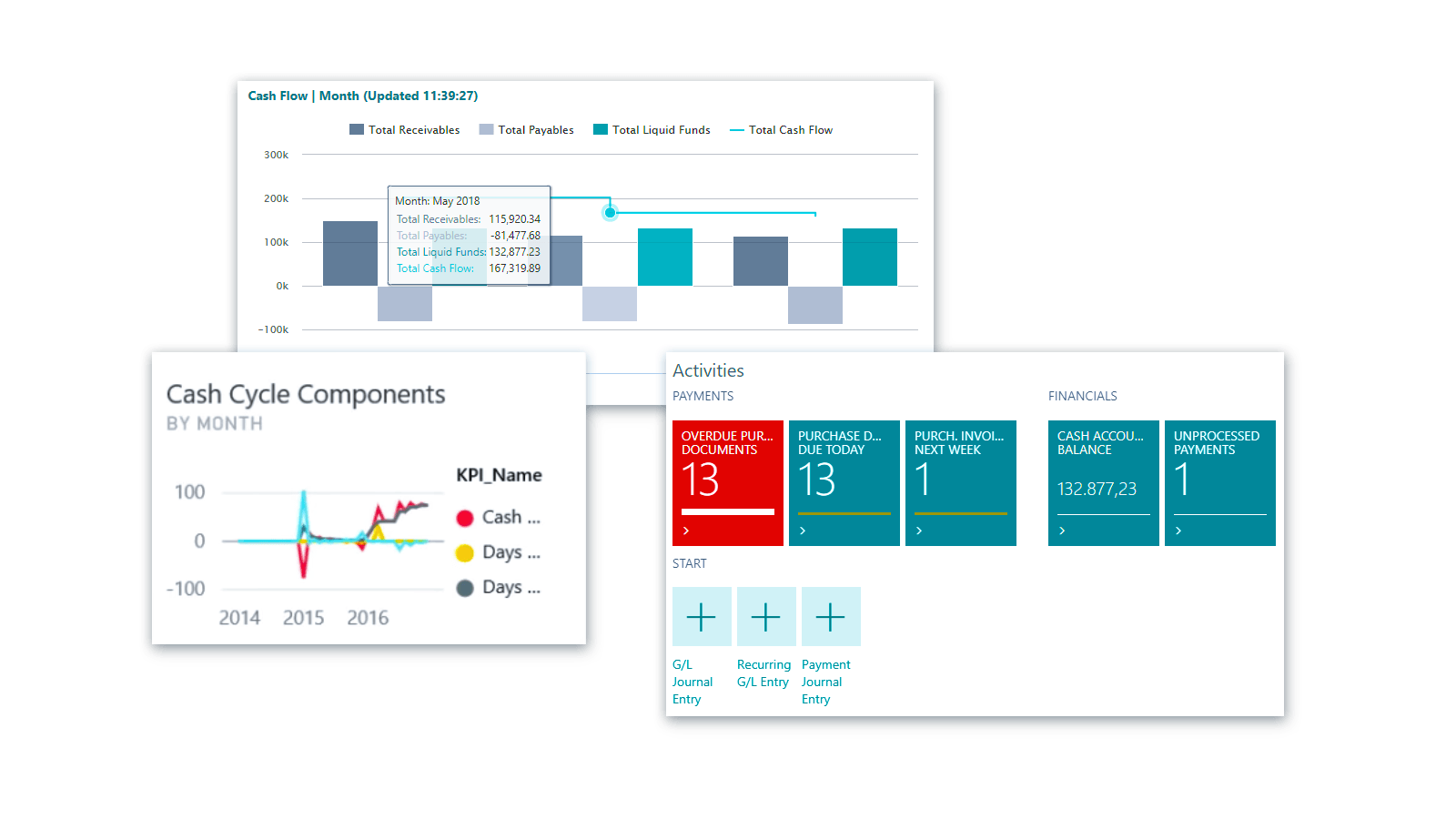 Conecte datos de contabilidad, ventas, compras, inventario e interacciones con los clientes para obtener una visión integral de su negocio. Represente gráficamente el rendimiento financiero en tiempo real con los paneles de Power BI integrados.