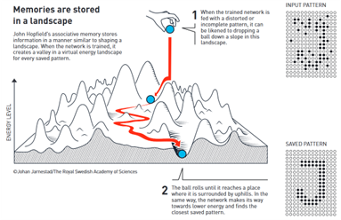 El ejercicio de John Hopfield es un gran ejemplo de creatividad, donde aplicó principios de la física a la computación neural. En este caso la minimización de energía (la vemos representada en el gráfico como los valles) para encontrar la mejor ruta hacia el estado de menor energía. También usó los modelos de vidrio de espín (una estructura compleja usada en física para describir materiales desordenados) para representar cómo una neurona puede almacenar información.