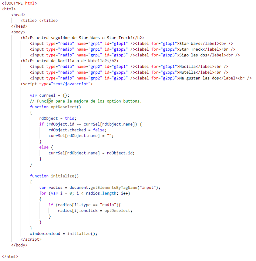 Supongamos que queremos mostrar una encuesta, donde cada pregunta de la encuesta, tiene varias respuestas gestionadas con controles Radio Button, pero queremos que nuestra encuesta, nos permitan dejar preguntas de sin respuesta, pese a haber seleccionado ya una opción.