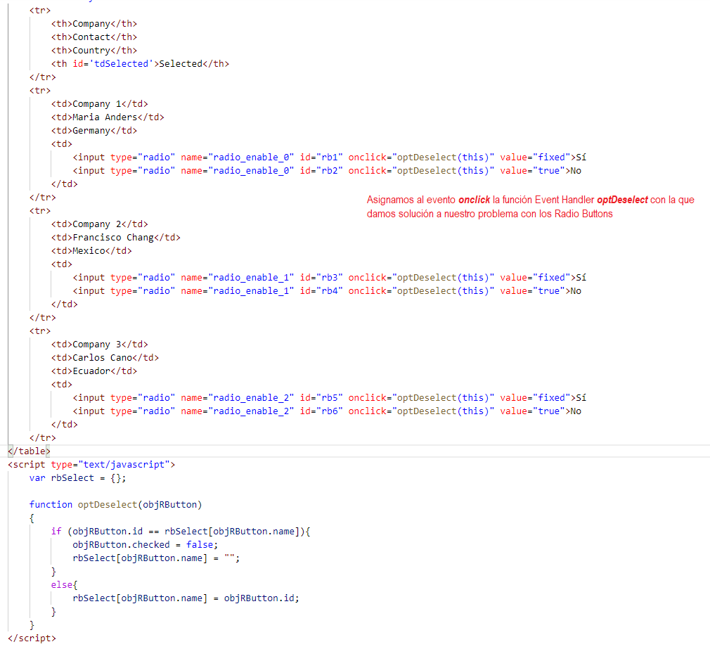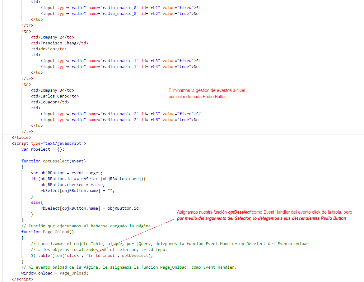 Bajo este criterio, si aplicamos la delegación de eventos de jQuery, nuestro código JavaScript, podría quedar como el que se muestra en la imagen adjunta y donde por jQuery, al evento click de la tabla, le asignamos como Event Handler nuestra función optDeselect, y donde, por medio del argumento selector, delegamos este evento a los Radio Button de la tabla.