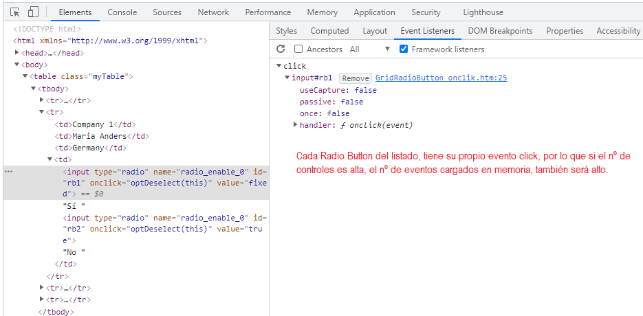 Esto lo podemos ver, si inspeccionamos nuestra página y abrimos el Event Listener, de las herramientas de desarrollo de nuestro navegador. Si accedemos a cada uno de los controles Radio Button, veremos que cada uno tiene su evento click, de forma que cuantos más registros tengamos en nuestro listado, más eventos tendremos cargados en memoria, haciendo más costosa la gestionar el navegador.