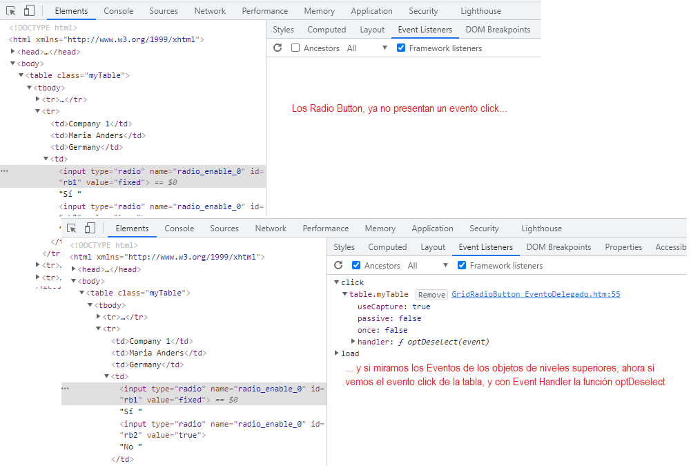 Si ahora inspeccionamos nuevamente nuestra página, y abrimos el Event Listener, y accedemos a cada uno de los controles Radio Button, veremos que estos ya no presentan un evento click, de forma directa y si marcamos la opción Ancestors, para ver los eventos de los objetos superiores, veremos que ahora sí, aparece nuestra función optDeselect como Event Handler del evento click de la tabla.