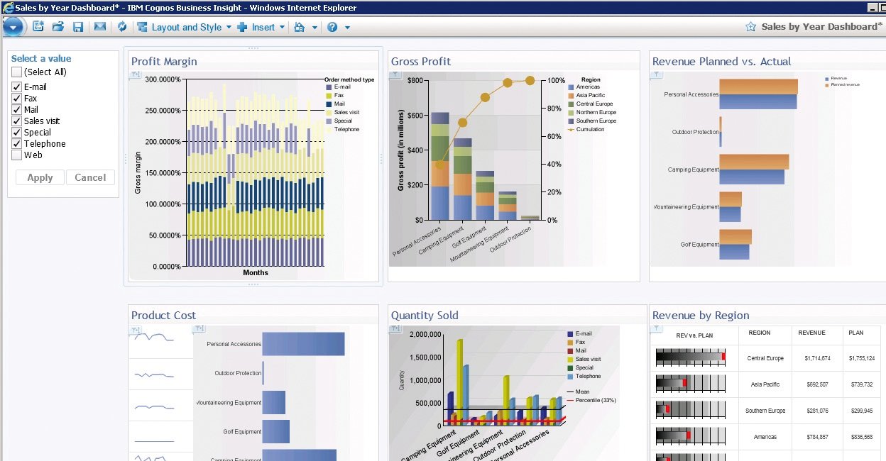 En algunos casos las decisiones se toman a tan corto plazo que es necesario conectar directamente a fuentes de datos operacionales (ERP, CRM…) Con Cognos Enterprise, todos los usuarios de negocio obtienen una vista completa del BI histórico junto con datos en tiempo real y probabilidades futuras para poder mejorar la toma de decisiones en un espacio de trabajo unificado. Los dashboards permiten:- Reunir, personalizar, analizar e interactuar con la información en un único lugar para trabajar con el BI y la analítica.