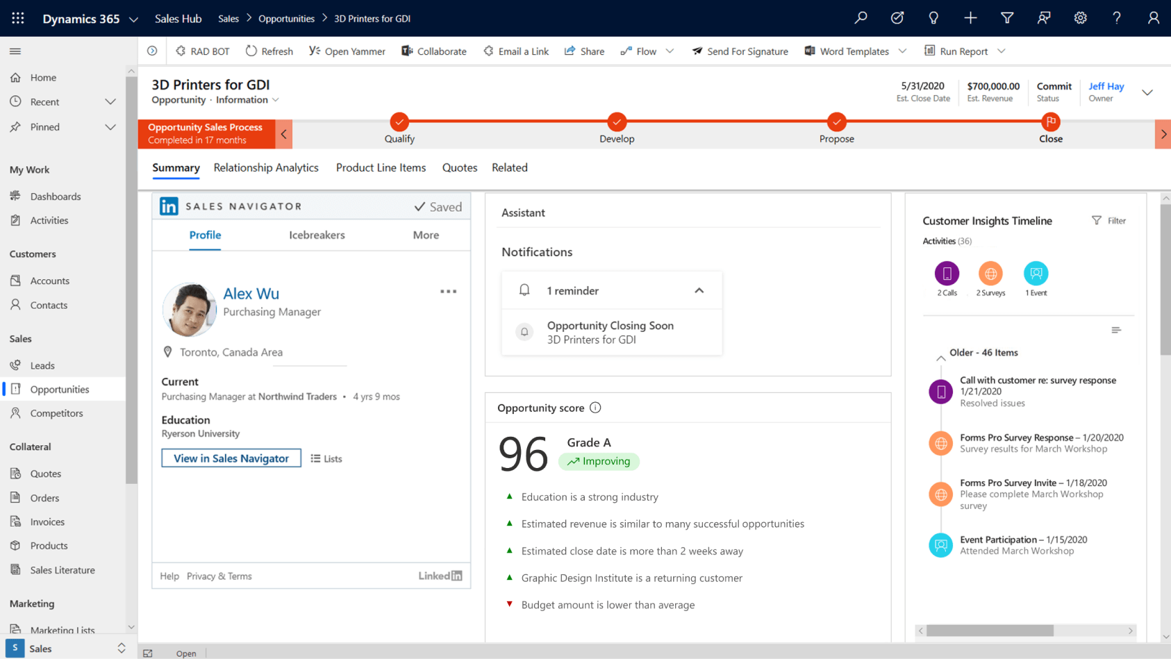 Posi especial atenció en les relacions amb les solucions i dades unificades de LinkedIn Sales Navigator, Dynamics 365 Sales i Office 365.