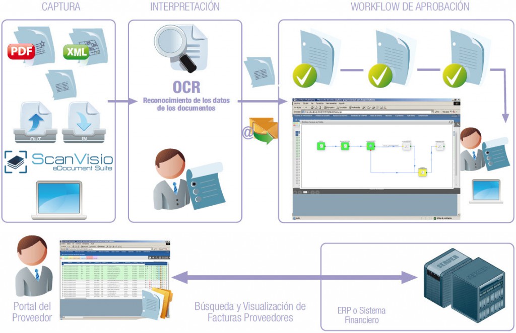 Les Factures de Proveïdors són rebudes per diferents mitjans (paper, email, PDF, XML, Facturae …) SCAN_VISIO eFactura resol des de la digitalització, l’extracció de dades del document, el workflow d’aprovació, la integració amb el Sistema Financer del Client i l’arxiu digital de les mateixes segons l’ordre EHA/962/2007.