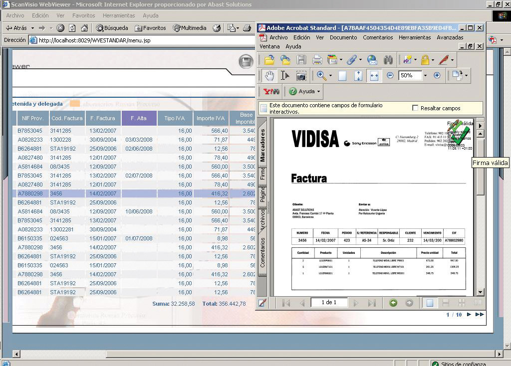 Complint amb les necessitats específiques de l’empresa, els documents es distribueixen automàticament per correu electrònic, arxivant simultàniament el document Factura en el Repositori Documental SCAN_VISIO Web Viewer permetent un accés immediat a les factures que poden ser consultades utilitzant índexs de cerca com el número de la factura, data de facturació, número de la comanda de venda o número del client.