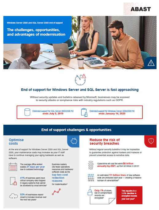 És el moment ideal per actualitzar i modernitzar canviant a les versions actuals de SQL Server i Windows Server, ja sigui mantenint la infraestructura on premise o migrant aquestes càrregues de treball a un entorn en el núvol d’Azure. Les noves versions Microsoft SQL Server 2019 i Windows Server 2019 inclouen noves característiques innovadores de seguretat i compliment, major rendiment, alta disponibilitat per a càrregues de treball crítiques, major compatibilitat per a entorns híbrids, etc. Noves opcions que t’ajuden a actualitzar i adoptar les tecnologies innovadores que necessites per fer avançar la teva organització. ABAST t’ofereix assessoria per escollir la solució que més s’adapta a les teves necessitats i serveis experts per realitzar aquestes actualitzacions.