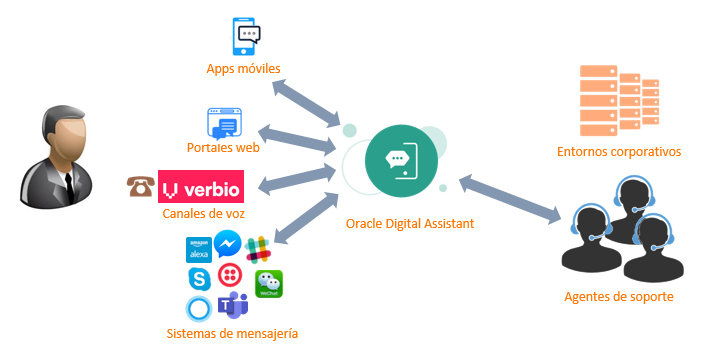 Així doncs, un assistent és capaç de resoldre diferents accions (una reserva de restaurant, la consulta de l’estat d’una comanda …). Per poder dur-les a terme amb èxit, la plataforma d’assistent digital haurà de connectar amb els entorns corporatius per obtenir i actualitzar dades (ERP, CRM …). Sense aquesta connexió que li permet donar funcionalitats empresarials, un assistent digital no podria oferir cap tipus de valor afegit als clients. El mateix assistent pot ser utilitzat en diferents canals (apps de missatgeria, apps mòbils, portals web o canals de veu), oferint una experiència omnicanal a través d’una única lògica conversacional. Finalment, si l’assistent digital no és capaç de donar una resposta podem connectar-lo amb una plataforma de suport d’agents humans, augmentant la capacitat de resposta i, per tant, la satisfacció dels nostres usuaris.
