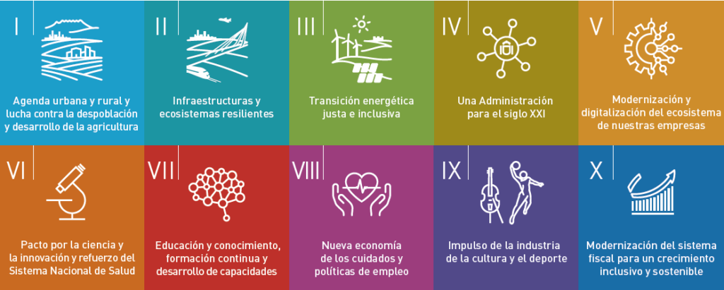 El Pla de Recuperació, Transformació i Resiliència de l’economia espanyola, presentat pel Govern d’Espanya a la UE, defineix com s’articularà l’ús d’aquests fons els propers anys. En concret detalla inversions previstes per un total de 69.528.000 d’Euros en període 2021-2023