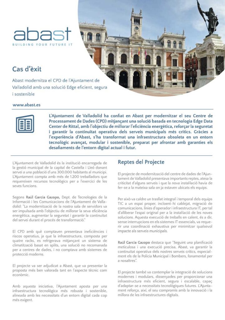 L’Ajuntament de Valladolid ha confiat en Abast per modernitzar el Centre de Processament de Dades (CPD) mitjançant una solució basada en tecnologia Edge Data Center de Rittal, amb l’objectiu de millorar l’eficiència energètica, reforçar la seguretat i garantir la continuïtat operativa dels serveis municipals més crítics. Gràcies a l’experiència d’Abast, s’ha transformat una infraestructura obsoleta en un entorn tecnològic avançat, modular i sostenible, preparat per fer front amb garanties als reptes de l’entorn digital actual i futur.