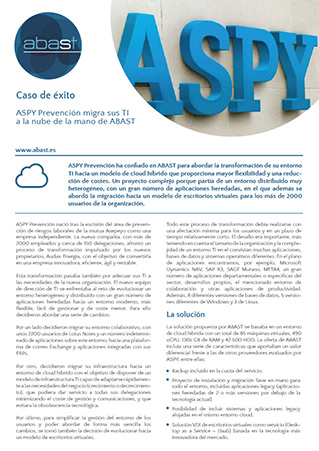 ASPY Prevenció ha confiat en ABAST per abordar la transformació del seu entorn TI cap a un model de cloud híbrid que proporciona major flexibilitat i una reducció de costos. Un projecte complex perquè partia d’un entorn distribuït molt heterogeni, amb un gran nombre d’aplicacions heretades, en què a més es va abordar la migració cap a un model d’escriptoris virtuals per als més de 2000 usuaris de l’organització.