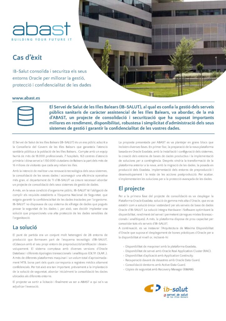 Sobre la participació d’ABAST en aquest projecte, Miguel Ángel Benito Tovar, Delegat de Protecció de Dades d’IB-SALUT, declara que “ABAST fa anys que treballa per al Servei de Salut demostrant el seu alt compromís i excel·lent fer tècnic, cosa que ha estat un factor decisiu per a la correcta implantació de la solució Oracle Advanced Security”.