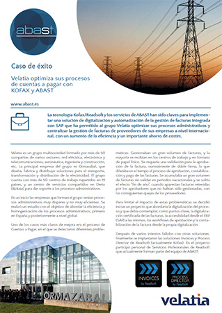 La tecnologia Kofax / Readsoft i els serveis d’ABAST han estat claus per implementar una solució de digitalització i automatització de la gestió de factures integrada amb SAP que ha permès a el grup Velatia optimitzar els seus processos administratius i centralitzar la gestió de factures de proveïdors de les seves empreses a nivell internacional, amb un augment de l’eficiència i un important estalvi de costos.