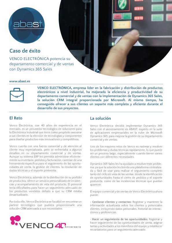 Venco Electrónica va decidir implementar Dynamics 365 Sales amb l’assessorament d’ABAST, expert en la suite d’aplicacions empresarials al núvol de Microsoft Dynamics 365, per millorar la gestió del departament comercial i de vendes.