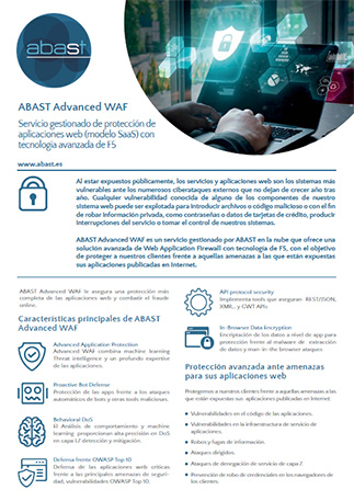 ABAST Advanced WAF és un servei gestionat per ABAST en el núvol que ofereix una solució avançada de Web Application Firewall amb tecnologia d’F5, amb l’objectiu de protegir els nostres clients enfront d’aquelles amenaces a què estan exposades les seves aplicacions publicades a Internet.