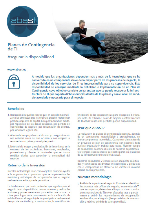 A mesura que les organitzacions depenen més i més de la tecnologia, que s’ha convertit en un component clau de la major part dels processos de negoci, la disponibilitat dels serveis de TI és imprescindible per a la seva supervivència. Aquesta disponibilitat s’aconsegueix mitjançant la definició i implementació d’un Pla de contingència l’objectiu del qual consisteix a garantir que es pot recuperar la infraestructura de TI que suporta aquests serveis dins els terminis i amb el nivell de servei acordat i necessari per al negoci.