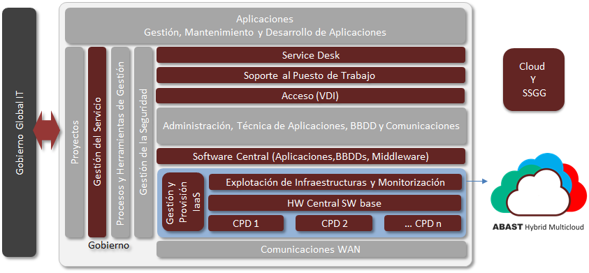 A ABAST hem integrat els serveis de núvol privat de DXC Technology VPC amb serveis de núvol públic líders (Microsoft Azure, Oracle Cloud …) dins d’un model de Núvol Híbrid Multicloud, al qual hem afegit altres serveis propis com escriptoris virtuals (DaaS), backup en el núvol o allotjament de sistemes legacy. Tot això amb connectivitat d’alta velocitat (latències de menys de 3ms), per proporcionar als nostres clients la possibilitat d’utilitzar a cada moment els serveis cloud més adequats a les seves necessitats i a la criticitat de les seves aplicacions.