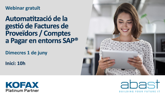 ABAST us convida a aquest webinar que tractarà sobre com automatitzar i optimitzar processos financers com els de comptes a pagar amb solucions Kofax certificades per SAP, que us permetran impulsar la productivitat, reduir costos, augmentar la precisió i visibilitat de les dades i millorar les relacions amb proveïdors i clients.