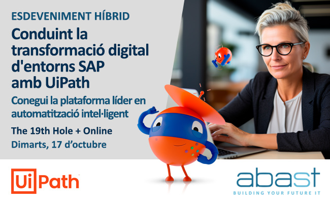 Des d’ABAST, UiPath Partner, us convidem a un esdeveniment en què us mostrarem tots els avantatges i capacitats d’automatització de UiPath per SAP. Tindrà lloc a l’espai Hole 19, situat a la planta 20 de torre Urquinaona, un mirador on gaudirem a més de les millors vistes de la ciutat de Barcelona.