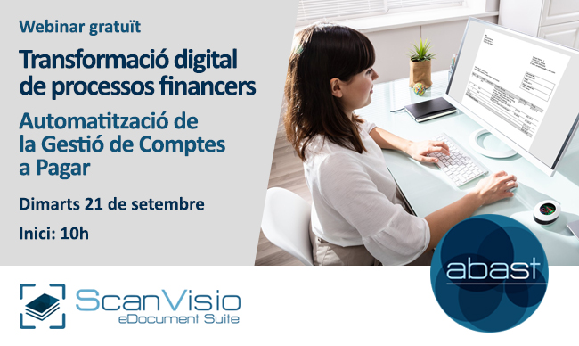 Et convidem a aquest webinar que tractarà sobre com automatitzar i optimitzar processos financers com els de comptes a pagar amb la nostra solució SCAN_VISIO eFactura, el que et permetrà impulsar la productivitat, reduir costos, augmentar la precisió i visibilitat de les dades i millorar les relacions amb proveïdors i clients.