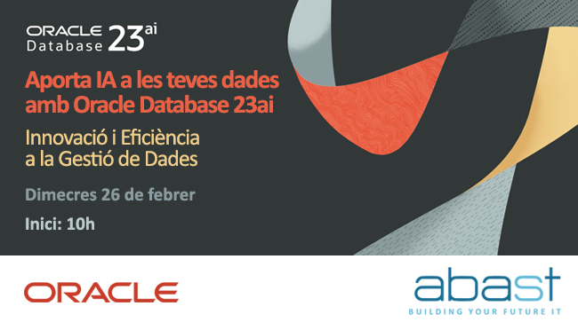 Ens complau convidar-te al nostre proper webinar sobre Oracle Database 23ai, on explorarem els grans beneficis que ens ofereix la darrera versió de la base de dades d’Oracle, integrant capacitats avançades d’intel·ligència artificial i optimitzant l’eficiència en la gestió de dades sota un concepte de Base de Dades Convergent.