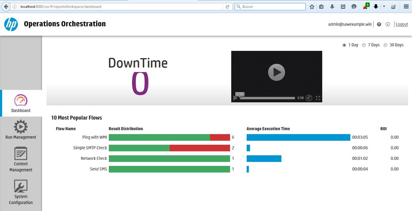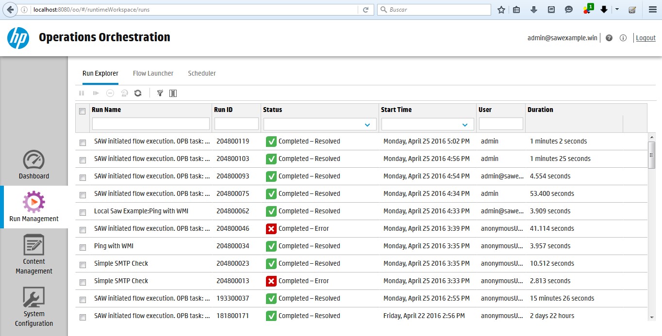 Operations Orchestration disposa d’una consola de gestió que li permet veure l’estat de les seves execucions i el resultat de les mateixes.