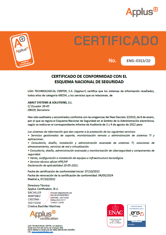 ABAST, com a proveïdor amb una àmplia experiència en projectes i serveis per a l’administració pública, assumeix aquest compromís amb la seguretat dels seus serveis i per això ha categoritzat, implantat i auditat el seu sistema de gestió de la seguretat d’acord amb aquesta norma, obtenint el certificat de conformitat amb l’Esquema Nacional de Seguretat per a sistemes d’informació de categoria mitjana.