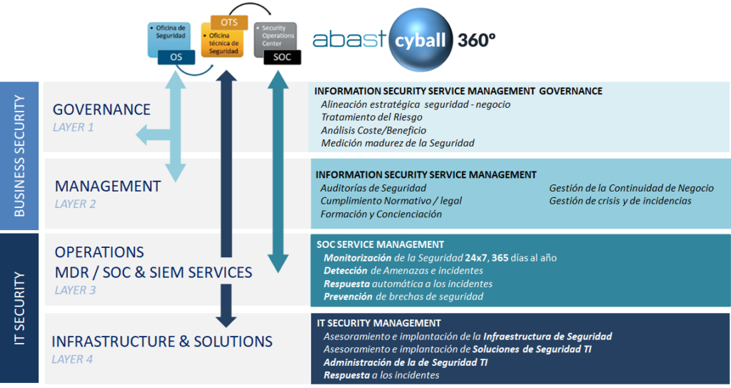 CYBALL, acrònim de Cybersecurity All, és el paraigua sota el qual des d’ABAST hem englobat tots els nostres serveis de OS, OTS i SOC que cobreixen les diferents capes de seguretat de la informació tant a l’àmbit de les TI com del negoci, aconseguint així donar una visió 360º de la seguretat a l’organització i proporcionar protecció i compliment en tots els àmbits.