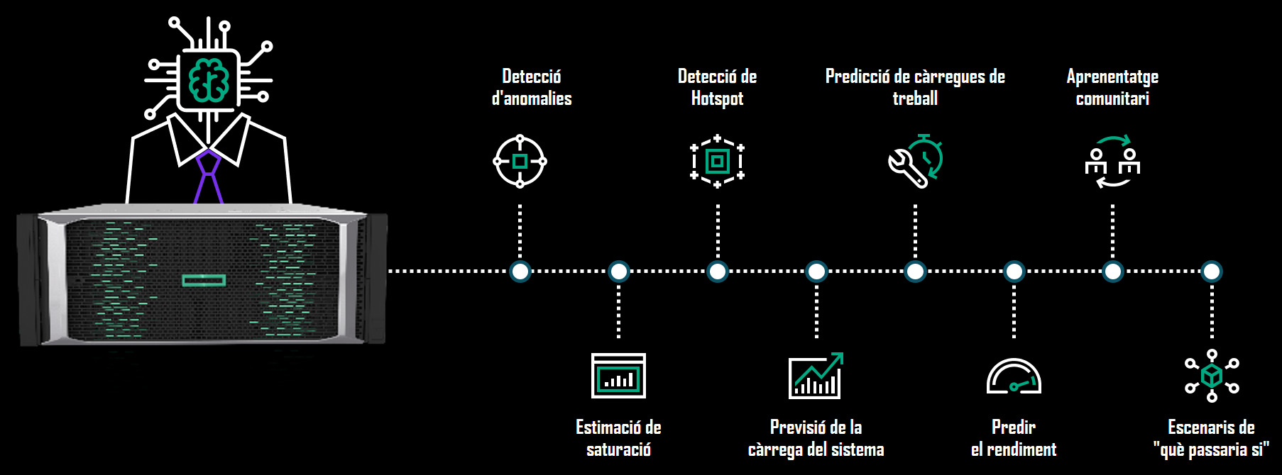 HPE Primera observa i estudia totes les cabines que hi ha repartides pel món, aprèn, prediu que és el que passarà, et recomana les millores que has de fer i finalment actua.