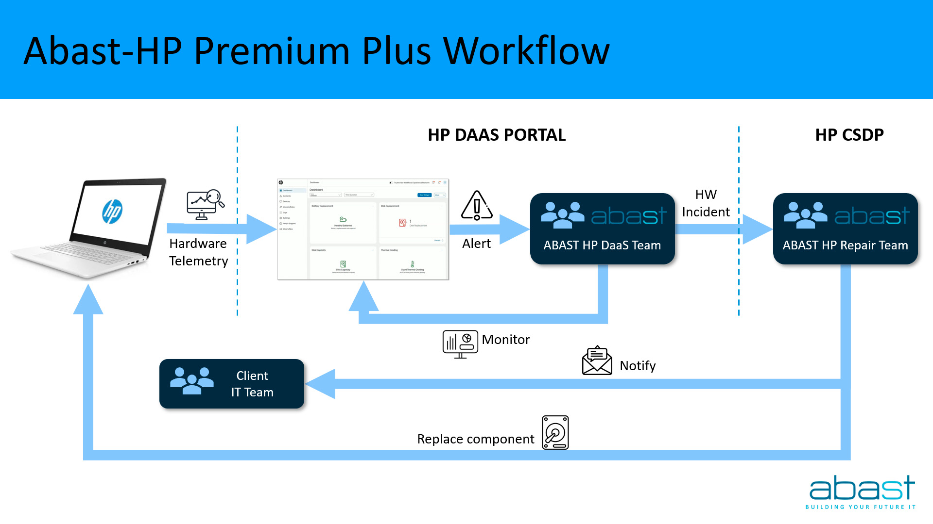 En aquest esquema, podràs descobrir el funcionament detallat del servei de suport tècnic Abast-HP Premium+ que oferim als nostres clients. Des del moment en què es detecta una incidència de hardware i rebem i verifiquem l’alerta, fins que el nostre equip d’Abast HP Repair s’engega per garantir una solució ràpida i efectiva.