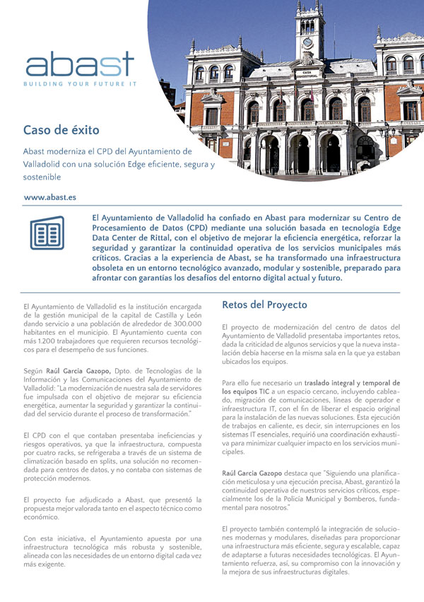 El Ayuntamiento de Valladolid ha confiado en Abast para modernizar su Centro de Procesamiento de Datos (CPD) mediante una solución basada en tecnología Edge Data Center de Rittal, con el objetivo de mejorar la eficiencia energética, reforzar la seguridad y garantizar la continuidad operativa de los servicios municipales más críticos. Gracias a la experiencia de Abast, se ha transformado una infraestructura obsoleta en un entorno tecnológico avanzado, modular y sostenible, preparado para afrontar con garantías los desafíos del entorno digital actual y futuro.