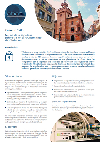 El departamento de TI del Ayuntamiento de Viladecans da servicio a más de 400 usuarios internos y gestiona también una serie de servicios ciudadanos como la oficina electrónica o una plataforma de Open Data. Su compromiso con la seguridad y la necesidad de renovación tecnológica y de ahorro de costes les hizo plantearse un proyecto de mejora de su seguridad perimetral. Este proyecto fue adjudicado a Abast Systems, que implementó una solución basada en firewalls de nueva generación Fortinet y balanceadores Radware.